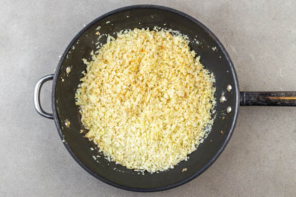 Den Blumenkohlreis in einer großen Pfanne mit 2EL Olivenöl bei mittlerer Hitze ca. 3Min. ohne Rühren braten. Dann einmal umrühren und weitere 3–5Min. braten, bis der Blumenkohlreis goldbraun und gar ist. Vom Herd nehmen, mit 1EL Olivenöl beträufeln und mit ½TL Salz würzen.