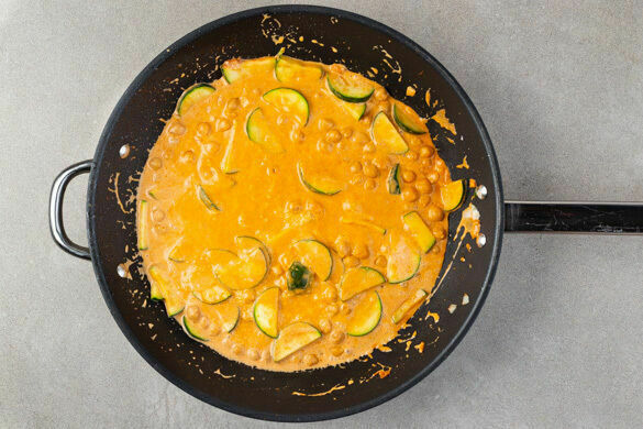 Die Zucchini zugeben und 3–4Min. weich braten, dann mit der Kokosmilch und 100ml Wasser ablöschen und aufkochen. Das Curry bei mittlerer Hitze 10–12Min. einköcheln lassen. Mit Salz und Pfeffer abschmecken.