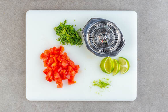 Inzwischen die Tomate in ca. 0,5cm große Stücke schneiden. Die ½ der Korianderblätter fein schneiden. Die Limettenschale fein abreiben, dann die Limette halbieren und eine Hälfte auspressen, die andere Hälfte in Spalten schneiden.