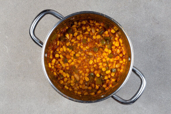 Die Bohnen und den Mais in einem Sieb mit kaltem Wasser abspülen und abtropfen lassen, dann mit in den Topf geben. 300ml heißes Wasser angießen und ½TL Salz einrühren. Das Chili bei starker Hitze zum Kochen bringen, dann bei mittlerer Hitze ca. 15Min. köcheln lassen. Ggf. mehr Wasser zugeben, falls das Chili zu dickflüssig ist.