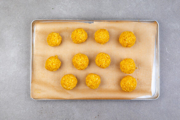 Den gegarten Reis in einem Sieb mit kaltem Wasser abschrecken, dann in einer Schüssel mit 2TL Currypaste und 3–4EL Mehl gut vermengen. Mit Salz abschmecken, dann mit einem Esslöffel Portionen abstechen und den Reis mit angefeuchteten Händen zu kleinen Bällchen formen.