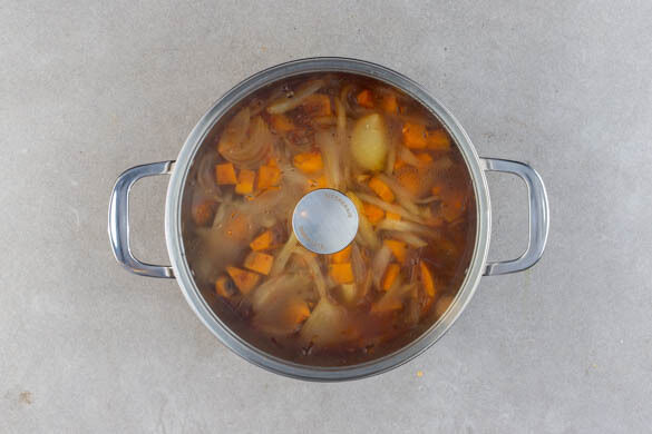 Die Gewürzmischung in den Topf rühren und ca. 1Min. mitbraten. Dann 600ml heißes Wasser angießen und aufkochen. Den Eintopf abgedeckt bei mittlerer bis niedriger Hitze 6–10Min. köcheln lassen, bis die Süßkartoffeln gar sind.
