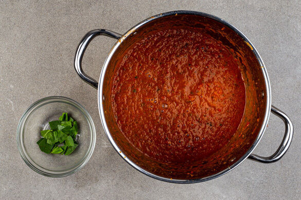 Die Basilikumblätter von den Stängeln zupfen und grob schneiden, dann die ½ des Basilikums in den Topf zu der Paprika geben und alles fein pürieren, dabei ggf. etwas Wasser zugeben. Die Paprikasuppe mit Salz, Zucker und Essig abschmecken und auf tiefe Teller verteilen. Mit dem übrigen Basilikum garnieren und mit der Konfitüre und dem Toast servieren.