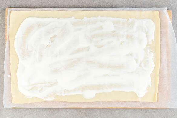 Die Teige mit dem Papier nach unten auf der Arbeitsfläche ausrollen und die Crème fraîche gleichmäßig auf den Teigen verstreichen.