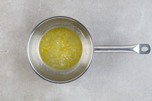 Den Knoblauch schälen und fein reiben oder sehr fein würfeln. Die Zitronenschale abreiben und die Zitrone halbieren, dann eine Hälfte auspressen, die andere Hälfte in Spalten schneiden. In einem kleinen Topf 2EL Butter schmelzen lassen und 1–2EL Zitronensaft, 1TL Zitronenschale, die ½ der Kapern und die ½ des Knoblauchs unterrühren. Den Topf vom Herd nehmen.