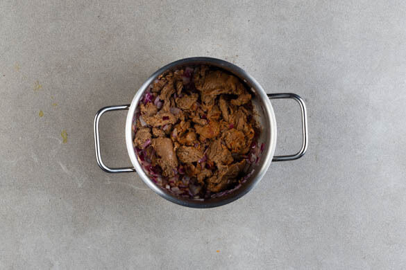 Die Zwiebeln schälen, halbieren und fein würfeln. 1EL Pflanzenöl in einem großen Topf erhitzen. Das vegane Rindergulasch ohne Sauce in den Topf geben, die Zwiebelwürfel hinzufügen und bei mittlerer Hitze ca. 3Min. anbraten. Die Gewürzmischung einrühren und ca. 1Min. mitbraten.