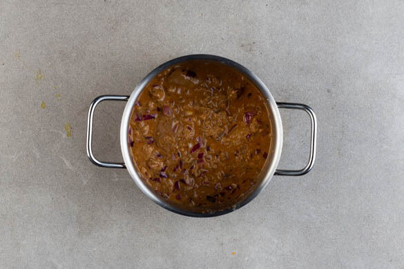 Die restliche Kokosmilch und die Rindergulasch-Sauce mit 100ml Wasser in den Topf gießen und unter Rühren aufkochen. Bei mittlerer Hitze 5–7Min. köcheln lassen und ggf. löffelweise Wasser zugeben, falls die Sauce zu dickflüssig ist.