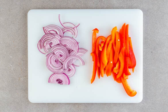 Den Backofen auf 220°C (200°C Umluft) vorheizen. Die Paprika vierteln, entkernen und in dünne Streifen schneiden. Die Zwiebel schälen, halbieren und in feine Streifen schneiden.