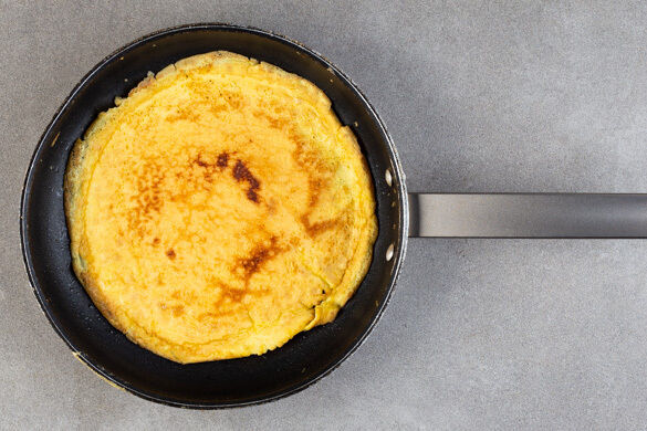 1EL Pflanzenöl in einer mittelgroßen Pfanne bei mittlerer bis starker Hitze erwärmen. Die Eiermischung hineingießen, dabei die Pfanne leicht schwenken, um ein gleichmäßiges Omelett zu erhalten. Das Omelett 2–3Min. anbraten, dann wenden und in ca. 1Min. goldbraun und gar braten.