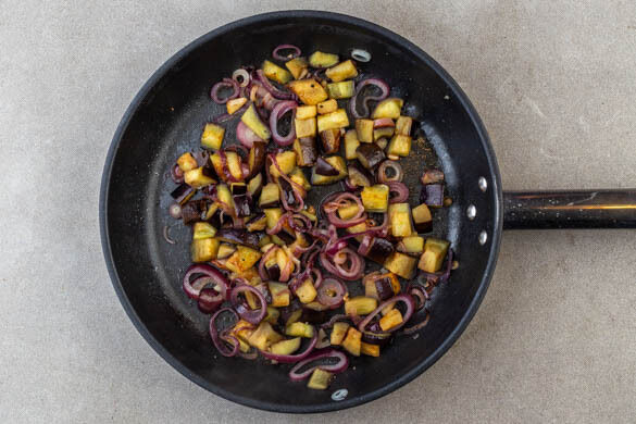 Die Zwiebel schälen und in feine Ringe schneiden. Den Knoblauch schälen und in feine Scheibchen schneiden. Die Aubergine in 1–2cm große Würfel schneiden. Das Gemüse in einer großen Pfanne mit 1½EL Olivenöl und je 1 Prise Salz und Pfeffer bei mittlerer Hitze in ca. 5Min. leicht gebräunt anbraten. Dann 3EL Wasser zugeben und abgedeckt 4–6Min. garen, bis die Aubergine weich ist.