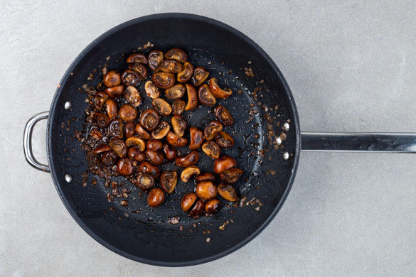 Die Schalotten und die Pilze in einer großen Pfanne mit 1EL Olivenöl bei starker Hitze 3–4Min. scharf anbraten, bis die Pilze keine Flüssigkeit mehr abgeben. Mit 1EL Balsamicoessig und 2EL Wasser ablöschen, dann bei niedriger Hitze ca. 15Min. garen. Mit je 1 Prise Salz, Pfeffer und Zucker würzen.