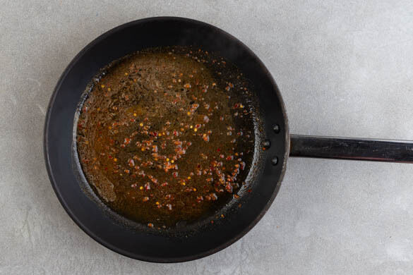 Die Gewürzmischung in einer kleinen, ofenfesten Pfanne mit 2EL Pflanzenöl, 1TL Honig, den eingeweichten Chiliflocken und dem Knoblauch bei mittlerer Hitze 1–2Min. erwärmen, dabei darauf achten, dass nichts anbrennt. Tipp: Wer keine ofenfeste Pfanne hat, kann die Bohnen später in eine kleine Auflaufform geben.