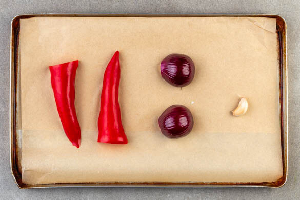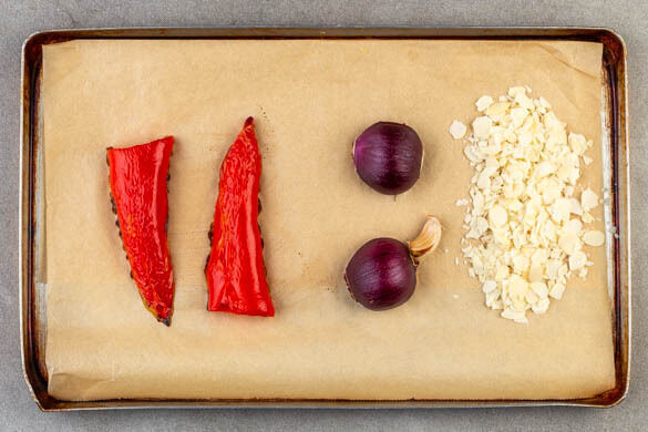 Den Backofen auf 220°C (200°C Umluft) vorheizen. Die Spitzpaprika halbieren und entkernen. Die Zwiebel schälen und halbieren. Den Knoblauch samt Schale und die Spitzpaprika sowie die Zwiebeln mit der Schnittfläche nach unten auf einem mit Backpapier ausgelegten Backblech platzieren, dabei etwas Platz für die Mandeln freilassen.