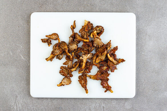 Eine mittelgroße Pfanne 0,5cm hoch mit Pflanzenöl füllen und mittelhoch erhitzen. Tipp: Das Öl ist heiß genug, sobald sich kleine Bläschen bilden, wenn man einen Holzspieß hineinhält. Die ½ der Pilze ins heiße Öl geben. In 3–4Min. goldbraun und knusprig frittieren, dabei mehrmals wenden. Die Pilze auf Küchenkrepp abtropfen lassen. Den Vorgang mit den übrigen Pilzen wiederholen.