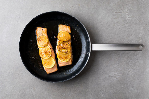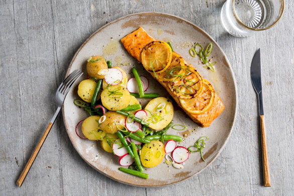 Das erfrischende Aroma der Zitrone ist in diesem schnell zubereiteten Gaumenschmaus ein echter Star. Die Zitronenscheiben werden nämlich unter den saftigen Lachsfilets in der Pfanne gebraten, wodurch sie leicht karamellisieren und dem Gericht einen ganz besonderen Geschmack verleihen. Dazu gibt es einen feinen Kartoffelsalat mit grünen Bohnen und Radieschen.