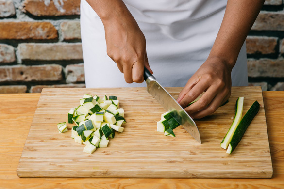 Die Zucchini längs vierteln und in ca. 1cm große Stücke schneiden.
