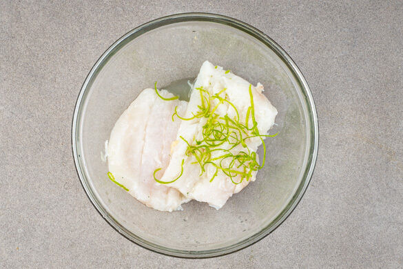 Die Limettenschale fein abreiben, dann die Limette halbieren und auspressen. Den Fisch in einem Sieb kalt abspülen, trocken tupfen und evtl. vorhandene Gräten entfernen. Anschließend mit der Limettenschale und dem -saft sowie je 1 Prise Salz und Pfeffer vermengen und beiseitestellen.