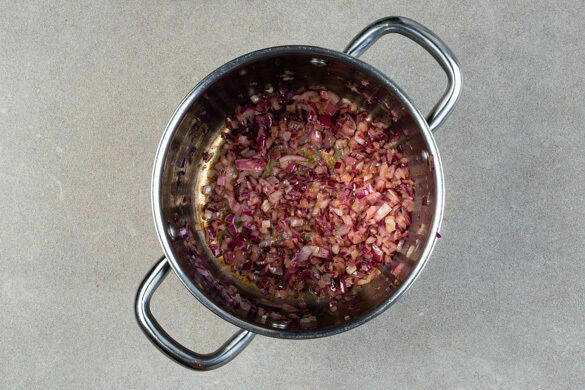 Die Zwiebeln schälen, halbieren und fein würfeln. 1EL der Zwiebelwürfel beiseitestellen, die übrigen Zwiebeln in einem großen Topf mit 2EL Olivenöl bei mittlerer bis starker Hitze in 3–5Min. goldbraun anbraten.
