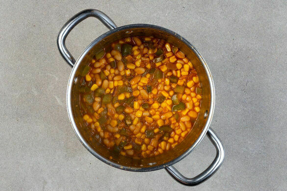 Die Bohnen und den Mais in einem Sieb mit kaltem Wasser abspülen und abtropfen lassen, dann mit in den Topf geben. 500ml heißes Wasser angießen und 1TL Salz einrühren. Das Chili bei starker Hitze zum Kochen bringen, dann bei mittlerer Hitze ca. 15Min. köcheln lassen. Ggf. mehr Wasser zugeben, falls das Chili zu dickflüssig ist.
