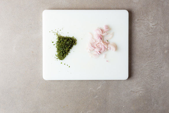 Die Schalotten in einer mittelgroßen Pfanne mit 1EL Olivenöl und 1 Prise Salz bei mittlerer bis starker Hitze 2–3Min. farblos anbraten.