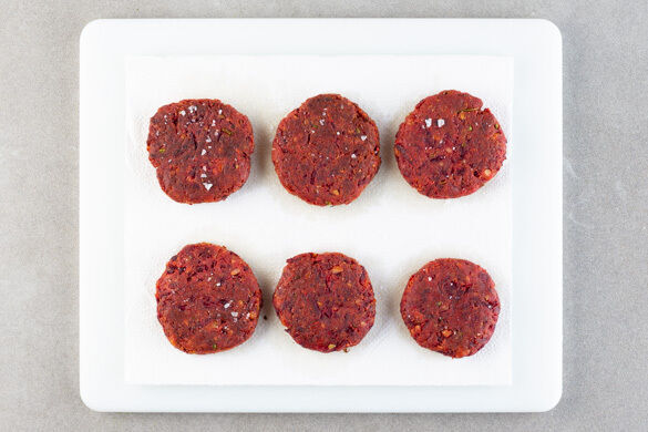 Die Rote Bete schälen und mit einer Küchenreibe grob raspeln. Die Kichererbsen in ein Sieb abgießen. Die Dillspitzen grob, die Dillstängel fein schneiden. Die Rote Bete, die Kichererbsen und die Dillstängel in einem kleinen Topf mit einem Stabmixer pürieren, dann 6–8EL Mehl, 1TL Salz und 2 kräftige Prisen Pfeffer unterkneten.