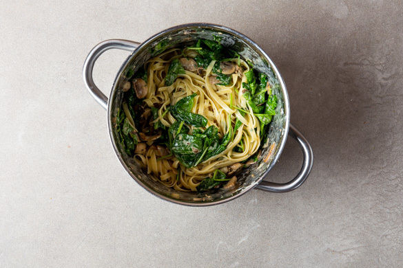 Die Pasta in das kochende Wasser geben und in 6–8Min. bissfest kochen. Mit einer Tasse etwas Kochwasser abschöpfen, dann die Pasta in ein Sieb abgießen. Die abgetropfte Pasta zurück in den Topf geben und mit 1EL Olivenöl vermengen.