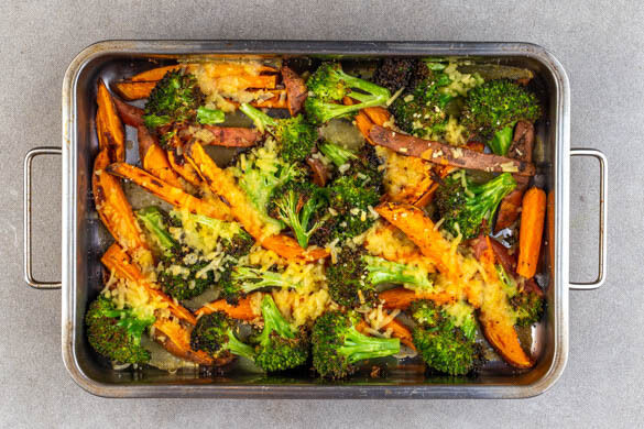 Den Brokkoli in mundgerechte Röschen schneiden, den Strunk ggf. schälen und grob würfeln. Den Brokkoli und die Süßkartoffeln mit 2½EL Pflanzenöl und ½TL Salz vermengen und in ca. 20Min. im Ofen rösten. Nach der Hälfte der Zeit wenden.