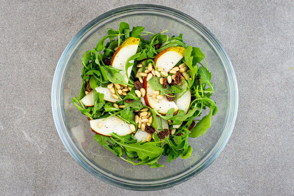 Die Birne längs halbieren und eine Hälfte in ca. 0,5cm dicke Scheiben schneiden, dabei das Kerngehäuse entfernen. Den Rucola in eine große Schüssel geben, dann je 1 Prise Salz und Pfeffer ca. 30Sek. einmassieren. Die Rosinen in ein Sieb abgießen und mit der ½ der Pinienkerne oder mehr und den Birnen unter den Salat heben.