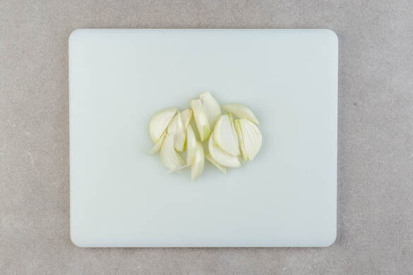 Den Backofen auf 220°C (200°C Umluft) vorheizen. Die Sardellen in ein Sieb abgießen, das Öl auffangen. Die Zwiebeln schälen, halbieren und in schmale Spalten schneiden.
