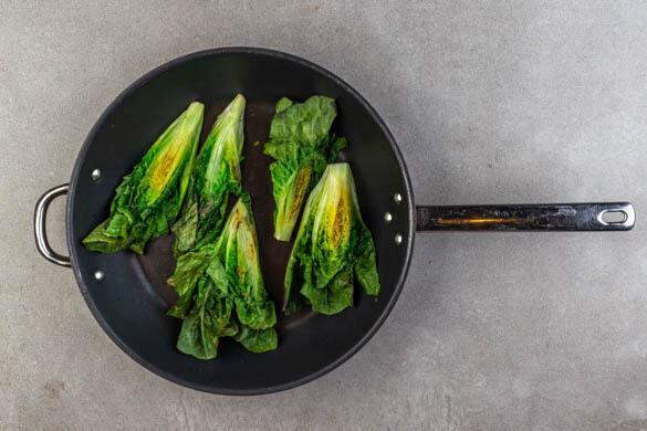 Den Romanasalat längs vierteln und mit den Schnittseiten nach unten in einer zweiten großen Pfanne bei mittlerer bis starker Hitze 3–5Min. braten, bis leichte Röstspuren erkennbar sind. Direkt vor dem Servieren mit dem Dressing beträufeln und mit dem restlichen Käse bestreut zur Pissaladière servieren.