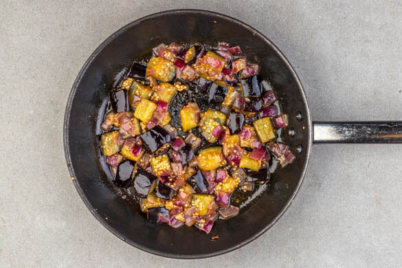 In einer großen Pfanne die Zwiebeln, die Auberginen, die Gewürzmischung, 2EL Olivenöl, ½TL Salz und 250ml Wasser abgedeckt bei mittlerer Hitze schmurgeln lassen, bis das Wasser verdampft ist. Dann ohne Deckel 6–8Min. unter regelmäßigem Rühren braten, bis das Gemüse goldbraun ist und die Aubergine sehr weich ist und zerfällt.