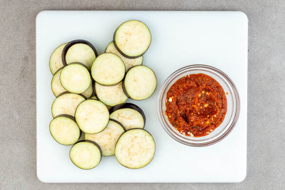 Den Backofen auf 220°C (Umluft 200°C) vorheizen. Den Knoblauch schälen und sehr fein würfeln oder durch eine Knoblauchpresse drücken, dann unter das Pesto rühren. Die Auberginen in dünne Scheiben schneiden.