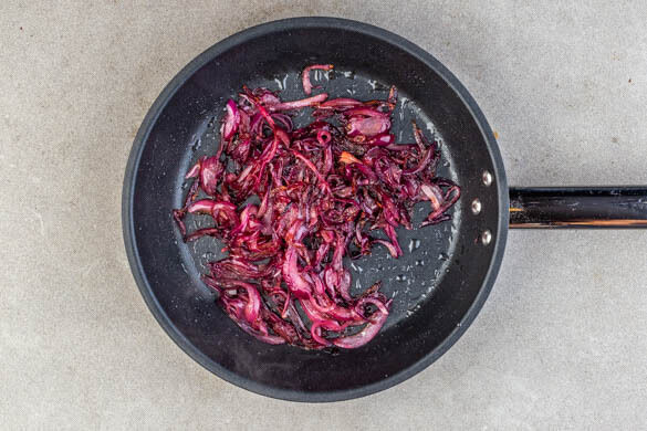 Die Zwiebeln schälen, halbieren, in feine Streifen schneiden und in einer mittelgroßen Pfanne mit 2EL Olivenöl und ½TL Salz bei niedriger bis mittlerer Hitze ca. 10Min. unter häufigem Rühren goldbraun braten. Ggf. esslöffelweise Wasser hinzugeben, damit die Zwiebeln nicht nicht zu trocken werden.