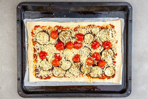 Die Zwiebeln auf dem Pesto verteilen, dann mit den Auberginen und den Tomaten belegen und das vegane Reibe-Topping darauf verteilen.