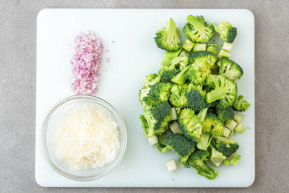 Den Backofen auf 220°C (200°C Umluft) vorheizen. In einem großen Topf ausreichend gesalzenes Wasser für die Pasta und das Gemüse zum Kochen bringen. Den Brokkoli in mundgerechte Röschen schneiden, den Strunk ggf. schälen und grob würfeln. Die Schalotten schälen und fein würfeln. Den Hartkäse fein reiben.