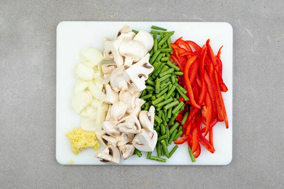 Die Zwiebeln, die Bohnen, die Paprika und die Pilze in einem Wok oder einer großen Pfanne mit 2EL Pflanzenöl bei mittlerer Hitze in 5–7Min. bissfest anbraten. Während der letzten 1–2Min. die Knoblauch-Ingwer-Paste unterrühren und mitbraten.