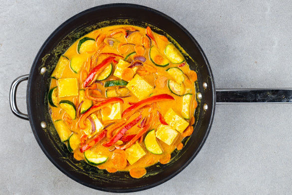 Das Gemüse mit der Kokosmilch und 300ml Wasser ablöschen, dann die Tofuwürfel und das Brühgewürz unterrühren. Mit Pfeffer abschmecken. Das Curry einmal aufkochen lassen und anschließend auf niedrigster Stufe 5–10Min. sanft köcheln lassen, bis das Gemüse gar ist.