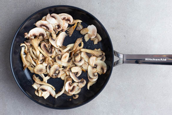 Die Austernpilze in grobe Streifen reißen und mit den Champignons in einer großen Pfanne mit 4EL Pflanzenöl bei mittlerer bis starker Hitze in 5–7Min. weich braten.
