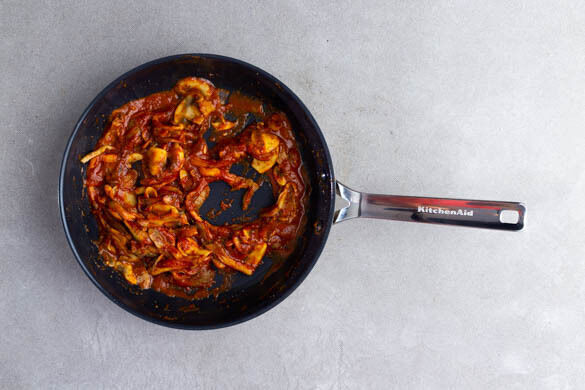 Die BBQ-Sauce, die Gewürzmischung, das Tomatenmark und 200ml Wasser in die Pfanne rühren und 1–3Min. köcheln lassen, bis eine sämige, glänzende Sauce entsteht. Mit Salz und Pfeffer abschmecken.