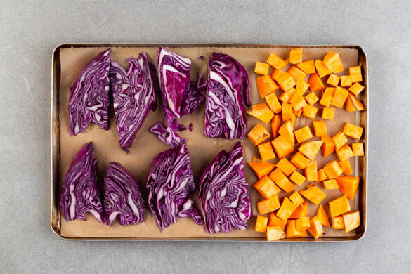 Die Süßkartoffeln schälen, in 2–3cm große Würfel schneiden und auf einem weiteren Backblech mit 2TL Pflanzenöl sowie 1 kräftigen Prise Salz vermengen. Das Gemüse im Ofen 18–24Min. rösten, bis der Rotkohl Röstspuren aufweist und die Süßkartoffeln goldbraun sind. Zur Hälfte der Zeit die Position der Bleche tauschen.