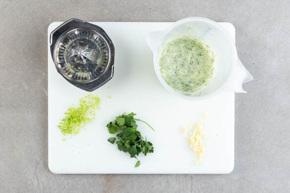 Den Koriander samt Stängeln grob schneiden, dabei einige Blätter für die Garnitur beiseitelegen. Die Limettenschale fein abreiben, dann die Limette halbieren und auspressen. Den Knoblauch schälen und fein würfeln. Den Koriander mit 2TL Limettensaft und 6EL Mayonnaise in einem hohen Gefäß mit einem Stabmixer zu einem cremigen Dressing pürieren.