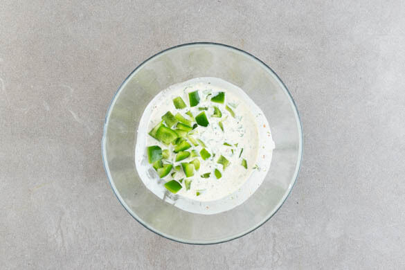 Das Dressing mit dem Joghurt, der ½ des Knoblauchs, den Chiliflocken sowie der Limettenschale verrühren und mit Salz abschmecken. Die Paprika vierteln und entkernen, in 1–2cm große Stücke schneiden und in das Dressing geben.