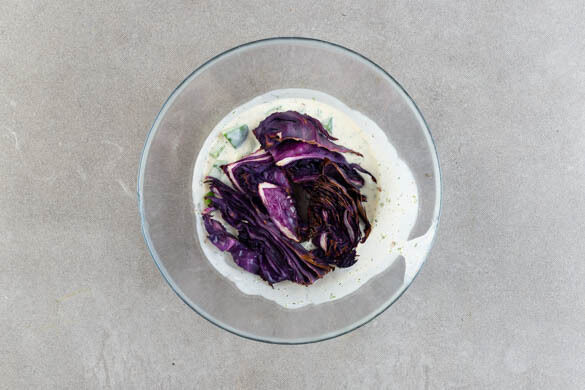 Den Backofen auf 220°C (200°C Umluft) vorheizen. Die Chiliflocken mit 2EL heißem Wasser bedecken und einweichen lassen. Die Rotkohle in jeweils 8 Spalten schneiden und auf einem mit Backpapier ausgelegten Backblech mit 2EL Pflanzenöl und ½TL Salz einreiben.