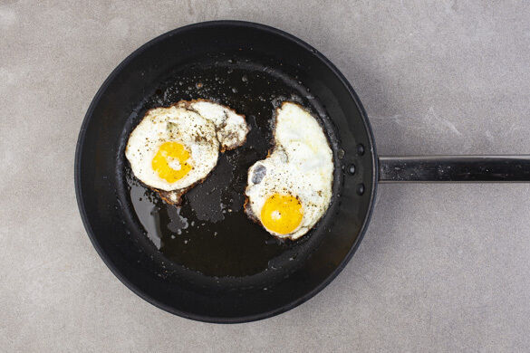 In einer zweiten Pfanne 2EL Pflanzenöl oder Butter bei mittlerer Hitze erwärmen. Die Eier aufbrechen, in die Pfanne gleiten lassen und in 3–4Min. zu Spiegeleiern braten. Mit je 1 kräftigen Prise Salz und Pfeffer würzen. Tipp: Wer möchte, dass auch das Eigelb fest wird, verwendet einen Deckel.