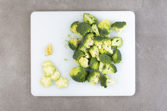 In einem mittelgroßen Topf ausreichend gesalzenes Wasser für die Nudeln zum Kochen bringen. Den Brokkoli in mundgerechte Röschen schneiden, den Strunk ggf. schälen und in dünne Scheiben schneiden. Den Knoblauch schälen und fein würfeln. Die Karotten ggf. schälen und grob raspeln.