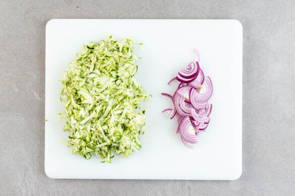 In einem großen Topf ausreichend gesalzenes Wasser für die Pasta zum Kochen bringen. Die Zucchini mit einer Küchenreibe grob raspeln und mit den Händen oder in einem sauberen Tuch möglichst viel Flüssigkeit ausdrücken. Die Zwiebeln schälen, halbieren und in feine Streifen schneiden.