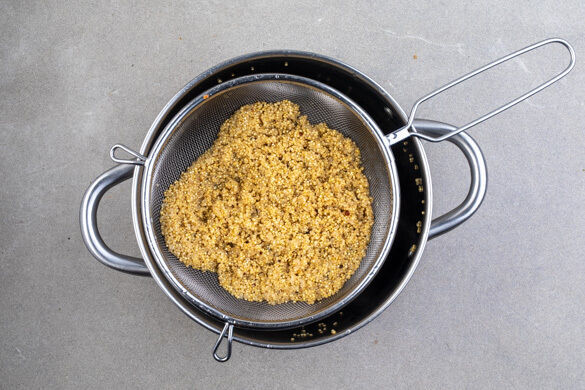 Die Quinoa in einem feinmaschigen Sieb mit warmem Wasser abspülen, in das kochende Wasser im mittelgroßen Topf geben und 18–20Min. abgedeckt bei niedriger bis mittlerer Hitze sanft köcheln lassen. Anschließend vom Herd nehmen.