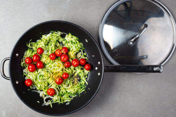 Die Zwiebeln, den Knoblauch, die Zucchini und die Kirschtomaten in einer großen Pfanne mit 1EL Olivenöl und 1 Prise Salz bei mittlerer bis starker Hitze 1–2Min. anbraten.