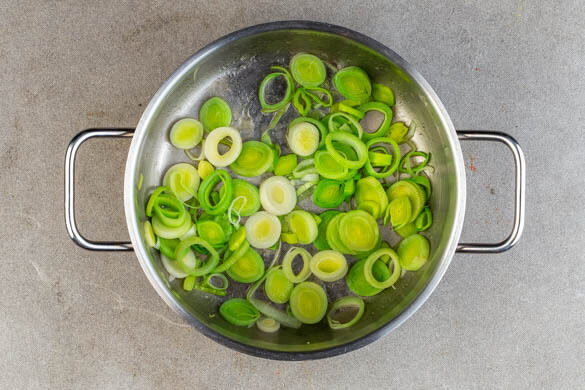 Den Lauch in dünne Ringe schneiden und mit 1EL Butter in einem mittelgroßen Topf bei mittlerer Hitze in ca. 5Min. glasig braten. Das Brühgewürz in 750ml heißem Wasser auflösen. Die Tomaten grob würfeln.