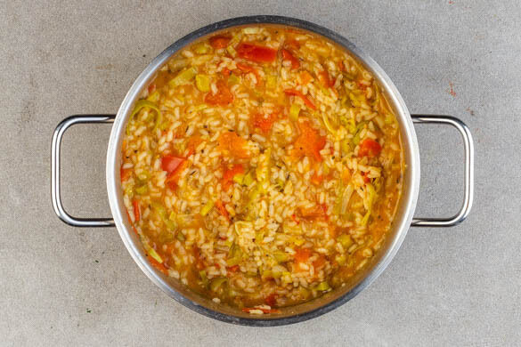 Die ½ der Gewürzmischung und den Reis in den Topf geben und ca. 1Min. anrösten. Mit 1EL Essig ablöschen und die Tomaten zugeben. Nach und nach mit der Brühe ablöschen und stetig rühren, damit der Reis nicht ansetzt. Diesen Vorgang 18–20Min. lang wiederholen, bis die Brühe aufgebraucht und der Reis bissfest ist.